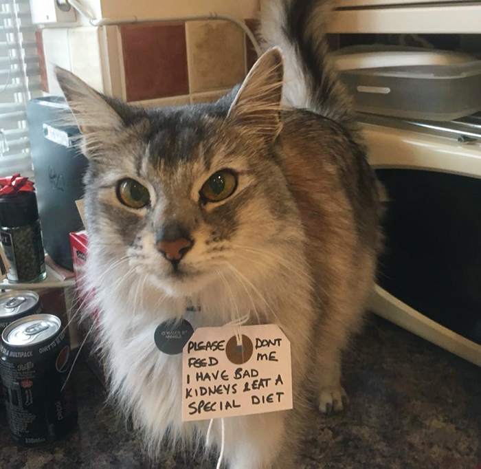 “I wasn’t sure which neighbours he visited or how far he went so I wasn’t sure what to do. After some thought, I decided to put a label on his collar to let people know not to feed him as he had a special diet — it worked!
