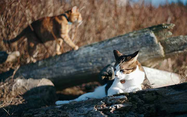 Over the years, Maureen has trained both cats, by using leads, to walk near her to keep them from danger: “We live in a very wild and remote part of British Columbia and there are cougars, bears, and wolves in our forests, so I need to be with them when they are outdoors to keep them safe. They are never allowed out at night because it’s too dangerous, but luckily, we have lots of grounds for them to walk in with me during the day. They love coming for a walk around the perimeter of the station with me each afternoon.”