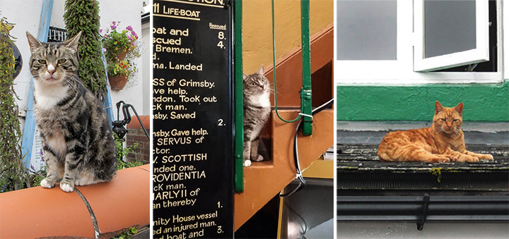 All three moggies are strays who have landed on their paws in their new lighthouse life with warm beds, a garden to roam, and lots of visitors to fuss over them.
