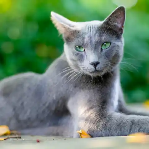 The Russian is a medium to large cat of elegant foreign type, but is not exaggerated. Its ears are large and pointed, wide at the base and set vertically on the head. The eyes are almond shaped and should be a vivid green. The face has an angled profile and prominent whisker pads which lend the face a gentle expression.