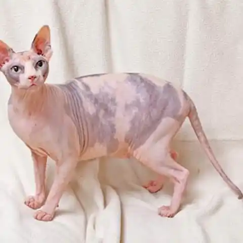 The most distinctive feature of the Sphynx is his lack of fur. The Sphynx is of medium-size boning and body conformation, with surprising weight for his size. The head shape is a modified wedge, with prominent cheekbones and whisker pads. The body is warm and soft to the touch. Despite being hairless, Sphynx have a range of different colours. There are black and whites, red and whites, torties, whites, blues, and lilacs.